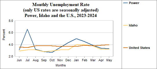 Power's monthly unemployment rate was 3.3 percent in May, 2024. This compares to 3.2 percent in Idaho as a whole.