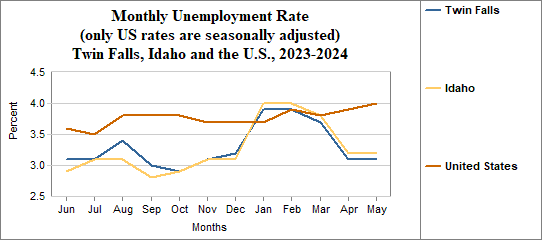 Twin Falls's monthly unemployment rate was 3.1 percent in May, 2024. This compares to 3.2 percent in Idaho as a whole.