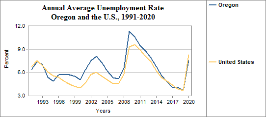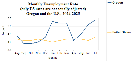 Oregon's monthly unemployment rate was 5.4 percent in July, 2025. This compares to 4.3 percent in the U.S. as a whole.