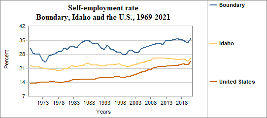 The self-employment rate is the percent of all employed people who have their own businesses (“proprietors”) as opposed to working for someone else in return for wages or salary.
