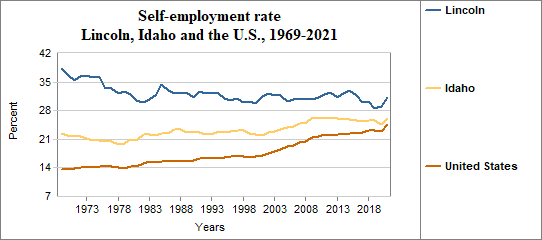 The self-employment rate is the percent of all employed people who have their own businesses (“proprietors”) as opposed to working for someone else in return for wages or salary.