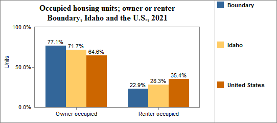 - in 2017-2021, 64.5 percent of all housing units were owner occupied, 19.1 percent were occupied by renters, and 16.3 percent were vacant.