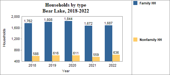 - Female-headed households with children (no husband present) made up 3.6 percent of all households in 2018-2022, compared to 5.5 percent in Idaho.