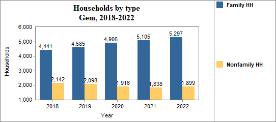 - Family households made up 73.6 percent of the total in 2018-2022, compared to 68.4 percent in Idaho.