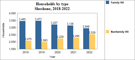 - Family households made up 53.8 percent of the total in 2018-2022, compared to 68.4 percent in Idaho.