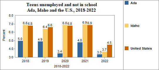 - Teens who were not working, looking for work, or in school made up 3.3 percent of all youth age 16-19 in 2018-2022, compared to 3.7 percent in Idaho.