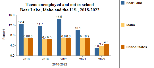 - Teens who were not working, looking for work, or in school made up 3.0 percent of all youth age 16-19 in 2018-2022, compared to 3.7 percent in Idaho.