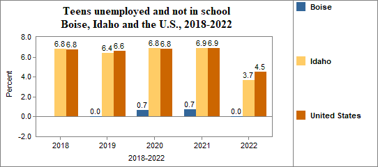 - Teens who were not working, looking for work, or in school made up 0.0 percent of all youth age 16-19 in 2018-2022, compared to 3.7 percent in Idaho.