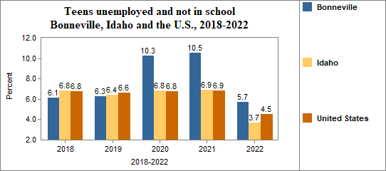 - Teens who were not working, looking for work, or in school made up 5.7 percent of all youth age 16-19 in 2018-2022, compared to 3.7 percent in Idaho.