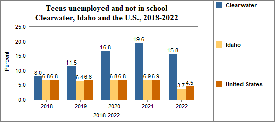 - Teens who were not working, looking for work, or in school made up 15.8 percent of all youth age 16-19 in 2018-2022, compared to 3.7 percent in Idaho.