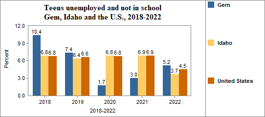- Teens who were not working, looking for work, or in school made up 5.2 percent of all youth age 16-19 in 2018-2022, compared to 3.7 percent in Idaho.