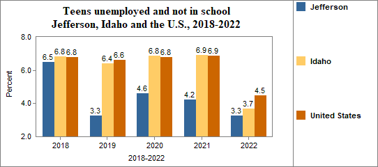 - Teens who were not working, looking for work, or in school made up 3.3 percent of all youth age 16-19 in 2018-2022, compared to 3.7 percent in Idaho.