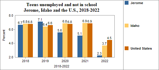 - Teens who were not working, looking for work, or in school made up 2.3 percent of all youth age 16-19 in 2018-2022, compared to 3.7 percent in Idaho.