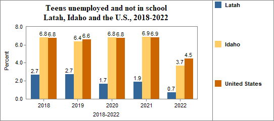 - Teens who were not working, looking for work, or in school made up 0.7 percent of all youth age 16-19 in 2018-2022, compared to 3.7 percent in Idaho.
