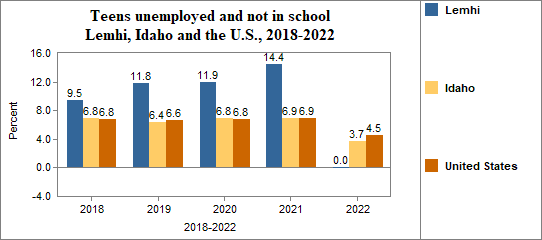- Teens who were not working, looking for work, or in school made up 0.0 percent of all youth age 16-19 in 2018-2022, compared to 3.7 percent in Idaho.
