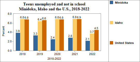 - Teens who were not working, looking for work, or in school made up 2.1 percent of all youth age 16-19 in 2018-2022, compared to 3.7 percent in Idaho.