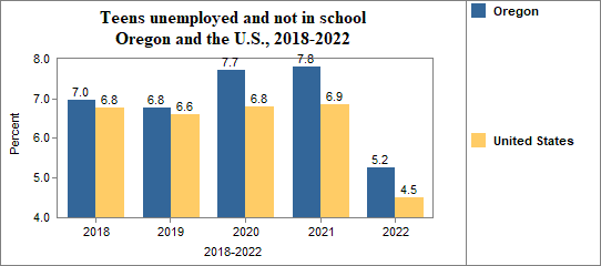 - Teens who were not working, looking for work, or in school made up 5.2 percent of all youth age 16-19 in 2018-2022, compared to 4.5 percent in the U.S..