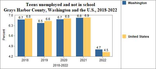 - Teens who were not working, looking for work, or in school made up NA percent of all youth age 16-19 in 2018-2022, compared to NA percent in Washington.