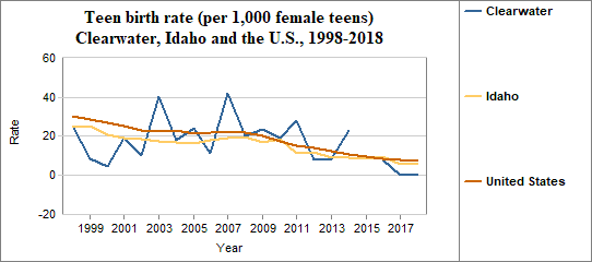 The teen birth rate is calculated by dividing the number of births to females age 15-17 by the number of females in that age group. We multiply the result by 1,000. In counties with relatively few people, a small change in the number of teen births may have a significant effect on rates from year to year. In Clearwater. . . - The teen birth rate in 2018 was 0 per 1,000, compared to 6 per 1,000 in Idaho.
