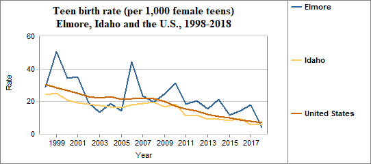 The teen birth rate is calculated by dividing the number of births to females age 15-17 by the number of females in that age group. We multiply the result by 1,000. In counties with relatively few people, a small change in the number of teen births may have a significant effect on rates from year to year. In Elmore. . . - The teen birth rate in 2018 was 4 per 1,000, compared to 6 per 1,000 in Idaho.
