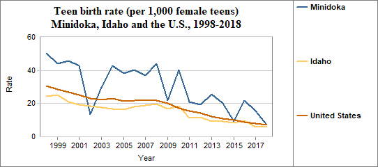 The teen birth rate is calculated by dividing the number of births to females age 15-17 by the number of females in that age group. We multiply the result by 1,000. In counties with relatively few people, a small change in the number of teen births may have a significant effect on rates from year to year. In Minidoka. . . - The teen birth rate in 2018 was 7 per 1,000, compared to 6 per 1,000 in Idaho.