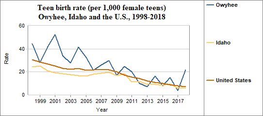 The teen birth rate is calculated by dividing the number of births to females age 15-17 by the number of females in that age group. We multiply the result by 1,000. In counties with relatively few people, a small change in the number of teen births may have a significant effect on rates from year to year. In Owyhee. . . - The teen birth rate in 2018 was 22 per 1,000, compared to 6 per 1,000 in Idaho.