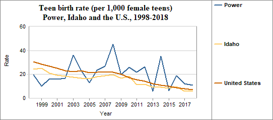 The teen birth rate is calculated by dividing the number of births to females age 15-17 by the number of females in that age group. We multiply the result by 1,000. In counties with relatively few people, a small change in the number of teen births may have a significant effect on rates from year to year. In Power. . . - The teen birth rate in 2018 was 11 per 1,000, compared to 6 per 1,000 in Idaho.
