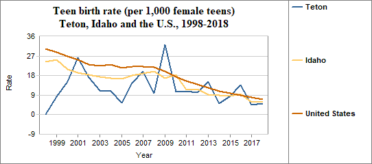 The teen birth rate is calculated by dividing the number of births to females age 15-17 by the number of females in that age group. We multiply the result by 1,000. In counties with relatively few people, a small change in the number of teen births may have a significant effect on rates from year to year. In Teton. . . - The teen birth rate in 2018 was 5 per 1,000, compared to 6 per 1,000 in Idaho.