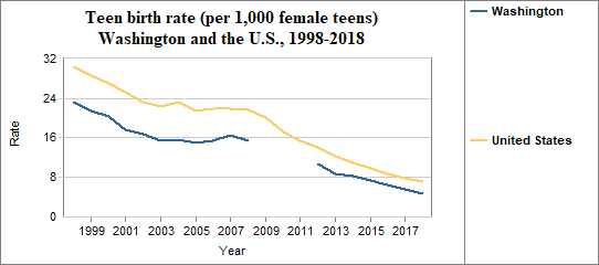 The teen birth rate is calculated by dividing the number of births to females age 15-17 by the number of females in that age group. We multiply the result by 1,000. In counties with relatively few people, a small change in the number of teen births may have a significant effect on rates from year to year. In Washington. . . - The teen birth rate in 2018 was 5 per 1,000, compared to 7 per 1,000 in the U.S..