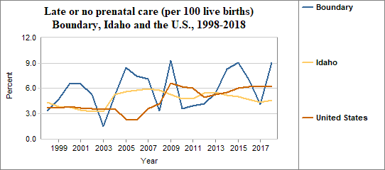 Late prenatal care is the care received starting in the third trimester of pregnancy. This indicator measures live births to mothers receiving no prenatal care in the first and second trimesters. The indicator is calculated by dividing the number of women who receive late or no prenatal care by the number of live births. We multiply the result by 100. In counties with relatively few people, a small number of women who receive late or no prenatal care may have a significant effect on percents from year to year.