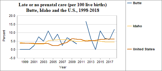 Late prenatal care is the care received starting in the third trimester of pregnancy. This indicator measures live births to mothers receiving no prenatal care in the first and second trimesters. The indicator is calculated by dividing the number of women who receive late or no prenatal care by the number of live births. We multiply the result by 100. In counties with relatively few people, a small number of women who receive late or no prenatal care may have a significant effect on percents from year to year.