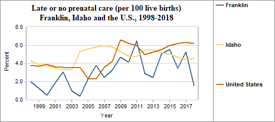 Late prenatal care is the care received starting in the third trimester of pregnancy. This indicator measures live births to mothers receiving no prenatal care in the first and second trimesters. The indicator is calculated by dividing the number of women who receive late or no prenatal care by the number of live births. We multiply the result by 100. In counties with relatively few people, a small number of women who receive late or no prenatal care may have a significant effect on percents from year to year.