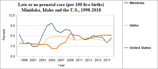 Late prenatal care is the care received starting in the third trimester of pregnancy. This indicator measures live births to mothers receiving no prenatal care in the first and second trimesters. The indicator is calculated by dividing the number of women who receive late or no prenatal care by the number of live births. We multiply the result by 100. In counties with relatively few people, a small number of women who receive late or no prenatal care may have a significant effect on percents from year to year.