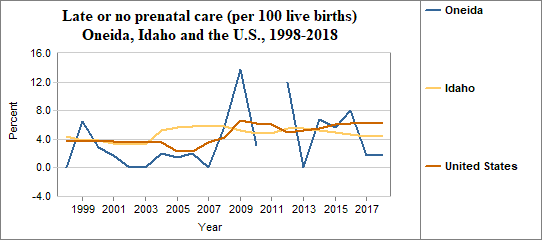 Late prenatal care is the care received starting in the third trimester of pregnancy. This indicator measures live births to mothers receiving no prenatal care in the first and second trimesters. The indicator is calculated by dividing the number of women who receive late or no prenatal care by the number of live births. We multiply the result by 100. In counties with relatively few people, a small number of women who receive late or no prenatal care may have a significant effect on percents from year to year.