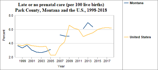 Late prenatal care is the care received starting in the third trimester of pregnancy. This indicator measures live births to mothers receiving no prenatal care in the first and second trimesters. The indicator is calculated by dividing the number of women who receive late or no prenatal care by the number of live births. We multiply the result by 100. In counties with relatively few people, a small number of women who receive late or no prenatal care may have a significant effect on percents from year to year.