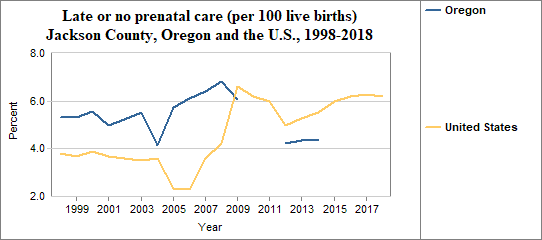 Late prenatal care is the care received starting in the third trimester of pregnancy. This indicator measures live births to mothers receiving no prenatal care in the first and second trimesters. The indicator is calculated by dividing the number of women who receive late or no prenatal care by the number of live births. We multiply the result by 100. In counties with relatively few people, a small number of women who receive late or no prenatal care may have a significant effect on percents from year to year.