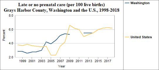 Late prenatal care is the care received starting in the third trimester of pregnancy. This indicator measures live births to mothers receiving no prenatal care in the first and second trimesters. The indicator is calculated by dividing the number of women who receive late or no prenatal care by the number of live births. We multiply the result by 100. In counties with relatively few people, a small number of women who receive late or no prenatal care may have a significant effect on percents from year to year.