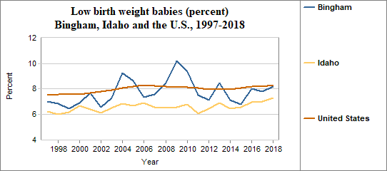 A low birth weight is under 2,500 grams, or roughly 5 lbs 8 oz. The percent of low birth weight babies is calculated by dividing the number of low birth weight babies by the number of live births. We multiply the result by 100. In counties with relatively few people, a small number of low birth weight babies may have a significant effect on percents from year to year. In Bingham . . . - 8.2 percent of babies had low birth weights in 2018, compared to 7.3 percent in Idaho