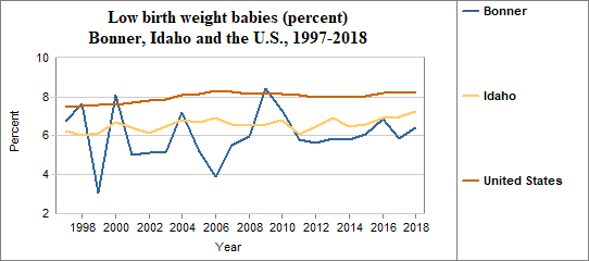 A low birth weight is under 2,500 grams, or roughly 5 lbs 8 oz. The percent of low birth weight babies is calculated by dividing the number of low birth weight babies by the number of live births. We multiply the result by 100. In counties with relatively few people, a small number of low birth weight babies may have a significant effect on percents from year to year. In Bonner . . . - 6.4 percent of babies had low birth weights in 2018, compared to 7.3 percent in Idaho