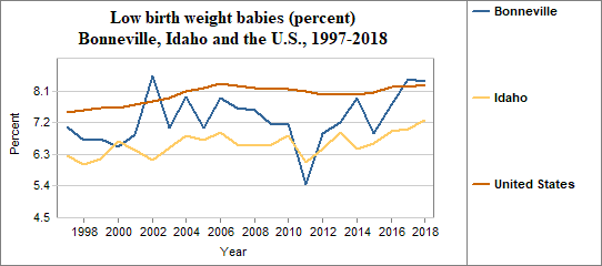 A low birth weight is under 2,500 grams, or roughly 5 lbs 8 oz. The percent of low birth weight babies is calculated by dividing the number of low birth weight babies by the number of live births. We multiply the result by 100. In counties with relatively few people, a small number of low birth weight babies may have a significant effect on percents from year to year. In Bonneville . . . - 8.4 percent of babies had low birth weights in 2018, compared to 7.3 percent in Idaho