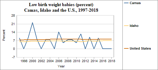 A low birth weight is under 2,500 grams, or roughly 5 lbs 8 oz. The percent of low birth weight babies is calculated by dividing the number of low birth weight babies by the number of live births. We multiply the result by 100. In counties with relatively few people, a small number of low birth weight babies may have a significant effect on percents from year to year. In Camas . . . - 0.0 percent of babies had low birth weights in 2018, compared to 7.3 percent in Idaho