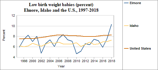 A low birth weight is under 2,500 grams, or roughly 5 lbs 8 oz. The percent of low birth weight babies is calculated by dividing the number of low birth weight babies by the number of live births. We multiply the result by 100. In counties with relatively few people, a small number of low birth weight babies may have a significant effect on percents from year to year. In Elmore . . . - 10.3 percent of babies had low birth weights in 2018, compared to 7.3 percent in Idaho