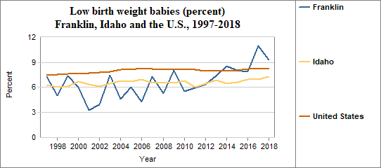 A low birth weight is under 2,500 grams, or roughly 5 lbs 8 oz. The percent of low birth weight babies is calculated by dividing the number of low birth weight babies by the number of live births. We multiply the result by 100. In counties with relatively few people, a small number of low birth weight babies may have a significant effect on percents from year to year. In Franklin . . . - 9.3 percent of babies had low birth weights in 2018, compared to 7.3 percent in Idaho