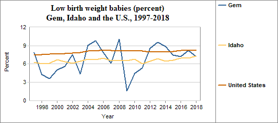 A low birth weight is under 2,500 grams, or roughly 5 lbs 8 oz. The percent of low birth weight babies is calculated by dividing the number of low birth weight babies by the number of live births. We multiply the result by 100. In counties with relatively few people, a small number of low birth weight babies may have a significant effect on percents from year to year. In Gem . . . - 7.2 percent of babies had low birth weights in 2018, compared to 7.3 percent in Idaho