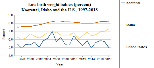 A low birth weight is under 2,500 grams, or roughly 5 lbs 8 oz. The percent of low birth weight babies is calculated by dividing the number of low birth weight babies by the number of live births. We multiply the result by 100. In counties with relatively few people, a small number of low birth weight babies may have a significant effect on percents from year to year. In Kootenai . . . - 5.0 percent of babies had low birth weights in 2018, compared to 7.3 percent in Idaho