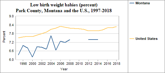 A low birth weight is under 2,500 grams, or roughly 5 lbs 8 oz. The percent of low birth weight babies is calculated by dividing the number of low birth weight babies by the number of live births. We multiply the result by 100. In counties with relatively few people, a small number of low birth weight babies may have a significant effect on percents from year to year. In Park County . . . - NA percent of babies had low birth weights in 1900, compared to NA percent in Montana