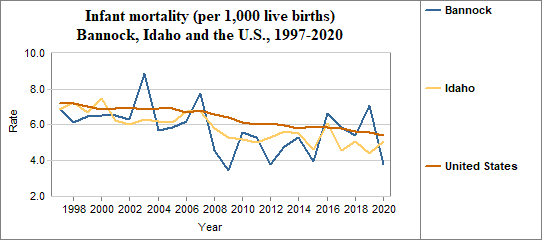 - The infant mortality rate was 3.8 per 1,000 in 2020, compared to 5.1 per 1,000 in Idaho
