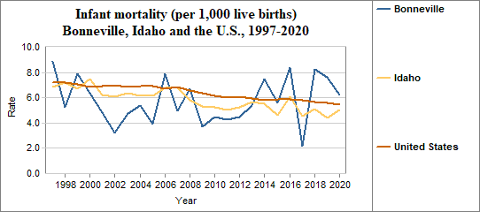 - The infant mortality rate was 6.2 per 1,000 in 2020, compared to 5.1 per 1,000 in Idaho