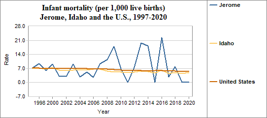 - The infant mortality rate was 0.0 per 1,000 in 2020, compared to 5.1 per 1,000 in Idaho