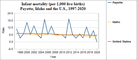 - The infant mortality rate was 0.0 per 1,000 in 2020, compared to 5.1 per 1,000 in Idaho